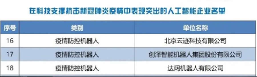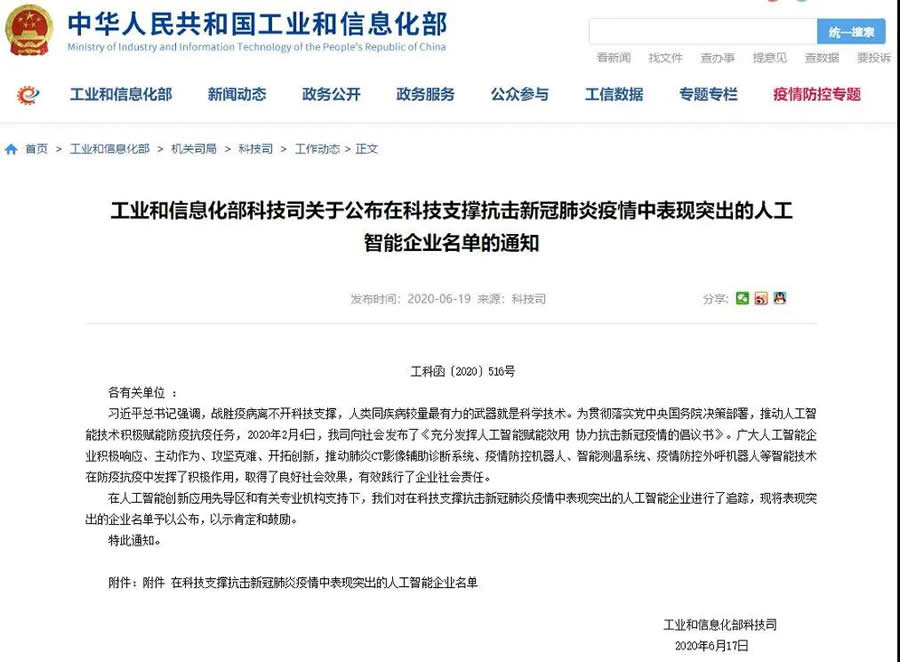 工業(yè)和信息化部科技司 關于公布在科技支撐抗擊新G肺炎疫情中表現 突出的人工智能企業(yè)名單的通知 工科函﹝2020﹞516號 各有關單位 : 總書記強調,戰(zhàn)勝疫病離不開科技支撐,人類同疾病較量有力的武器就是科學技術。為貫徹落實黨國務院決策部署,推動人工智能技術積J賦能防疫抗疫任務,2020年2月4日,我司向社會發(fā)布了《充分發(fā)揮人工智能賦能效用 協力抗擊新G疫情的倡議書》。廣大人工智能企業(yè)積J響應、主動作為、攻堅克難、開拓創(chuàng)新,推動肺炎CT影像輔助診斷系統、疫情防控機器人、智能測溫系統、疫情防控外呼機器人等智能技術在防疫抗疫中發(fā)揮了積J作用,取得了良好社會效果,有效踐行了企業(yè)社會責任。 在人工智能創(chuàng)新應用先導區(qū)和有關專業(yè)機構支持下,我們對在科技支撐抗擊新G肺炎疫情中表現突出的人工智能企業(yè)進行了追蹤,現將表現突出的企業(yè)名單予以公布,以示肯定和鼓勵。 特此通知。 工業(yè)和信息化部科技司2020年6月17日
