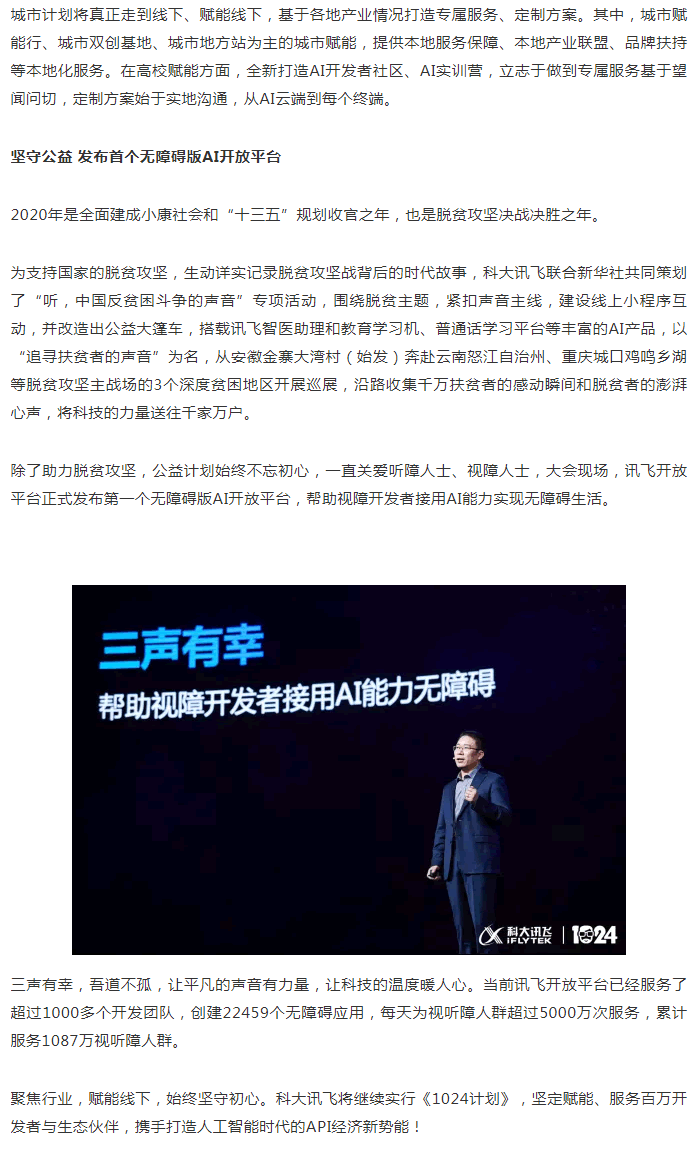 科大訊飛1024計劃全新升級為“AI賦能計劃”,發布聚焦行業的先導計劃、賦能線下的城市計劃、堅守初心的公益計劃!拔覀儗漠a品賦能走向行業賦能,實現進階服務,為生態和應用的發展提供更契合的A.I.源動力! 胡國平表示。