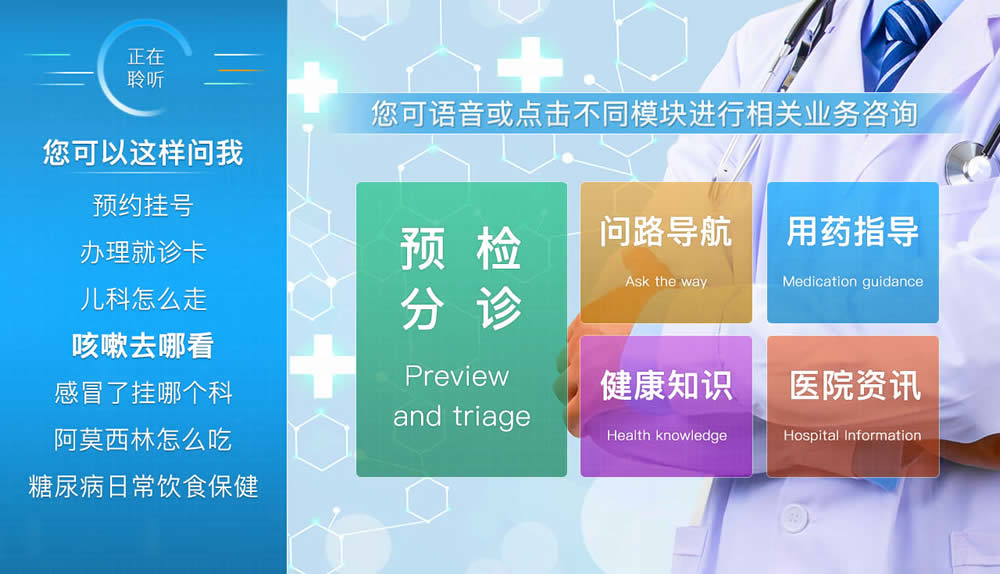 | 智能導診機器人開發初衷是解決門診導 醫人數較少、重復問答較多的現實情況。在醫 院業務G峰期人滿為患的情況下,智能醫療 服務機器人可以及時響應,可以指導患者就 醫、引導分診,同時向患者可以介紹醫院就 醫環境、門診就診流程和醫療保健知識等。 導診機器人通過語音識別、語音合成和自然 語言理解等技術,支持語音、觸控、圖像等 多種交互方式,改善就醫體驗,提G醫療服 務質量,是醫院智慧醫療的重要組成部分和 具體體現。 |