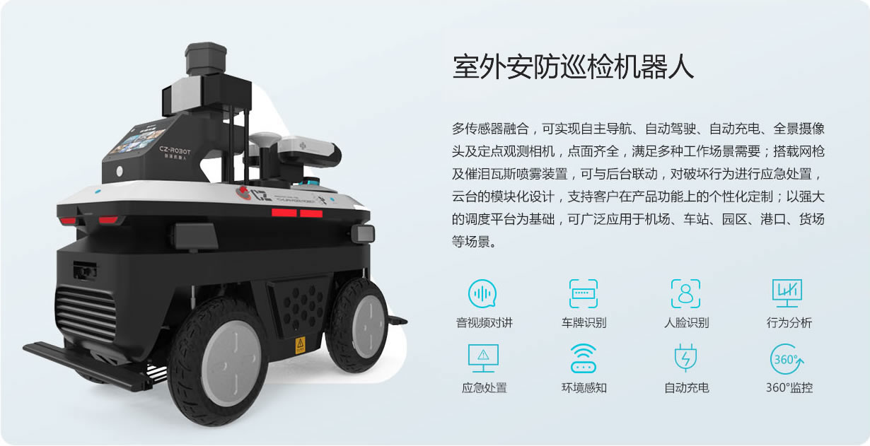 | 智能安防巡檢機器人是基于“人工智能+”設計開發的智能機器人平臺,集機器人視覺 系統、音視頻數據采集、消防和安防、無人駕駛技術于一體,搭載360°紅外攝像、超聲波雷達、雙目視覺攝像頭、網槍、催淚瓦斯噴射器、水炮、干粉滅火器等設備,基于輪式小車 實現全天候自動巡邏,360度聲音圖像同步回傳,自動躲避行人及障礙物。支持快速行走功 能,當發生異常時,可實現快速部署及現場支援,為用戶提供智能安全服務,是社區、學校 等公共場所人民群眾的保護神! |