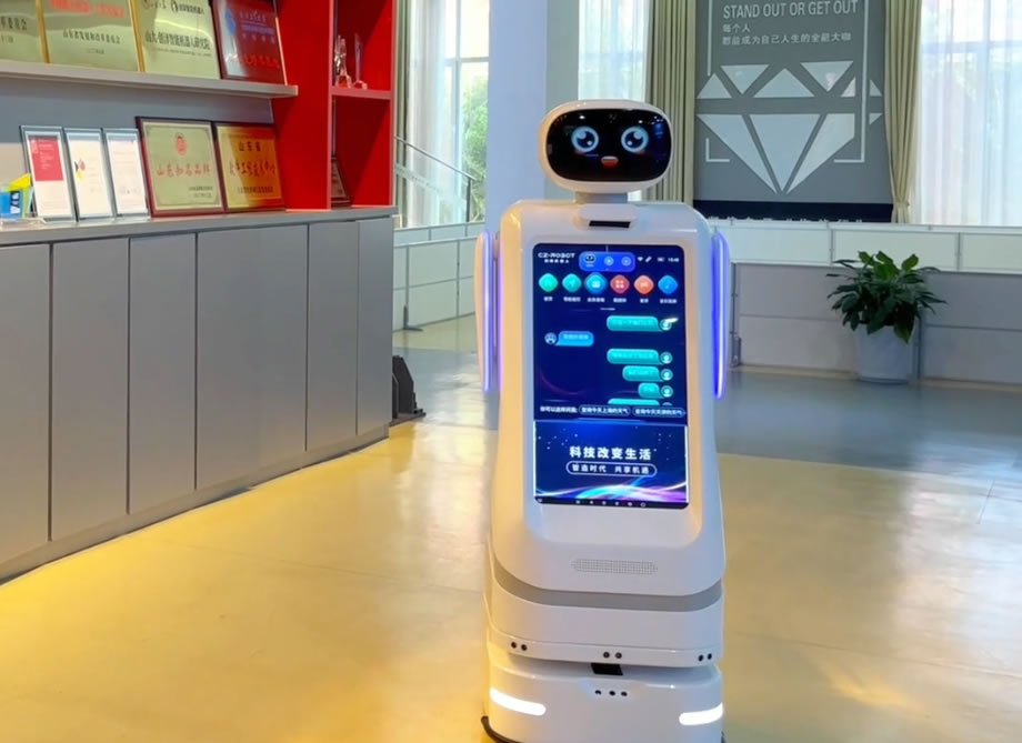來到創澤公司前臺,一名機器人接待員便主動迎上前來,詢問你的來訪目的,還可以為你做信息登記,前臺機器人可以變身前臺接待無接觸訪客邀約又具備變身行政助理的潛能